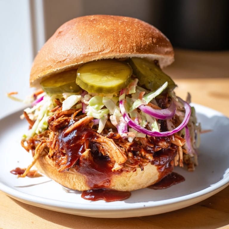 Keep the sauced chicken and slaw separate in airtight containers in the fridge for up to three days. Reheat the chicken gently in a skillet or microwave, adding a splash of water if it seems dry. Toast fresh buns and assemble just before eating so everything stays crisp and delicious.
