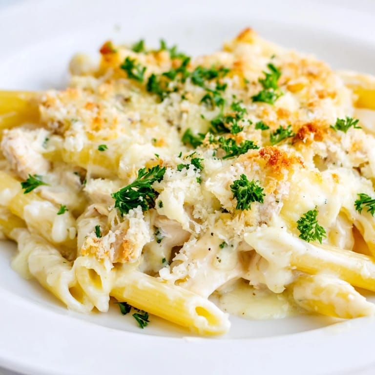 Save There's something deeply satisfying about pulling a bubbling casserole from the oven on a chilly evening, the smell of garlic and cream filling your kitchen like a warm hug. I discovered this Chicken Alfredo Bake years ago when I was overwhelmed with dinner plans for a small gathering, and I needed something that felt restaurant-worthy but didn't require me to plate six individual dishes. What started as a practical solution became the dish people now ask for by name, the one that somehow makes any table feel a little more special.
